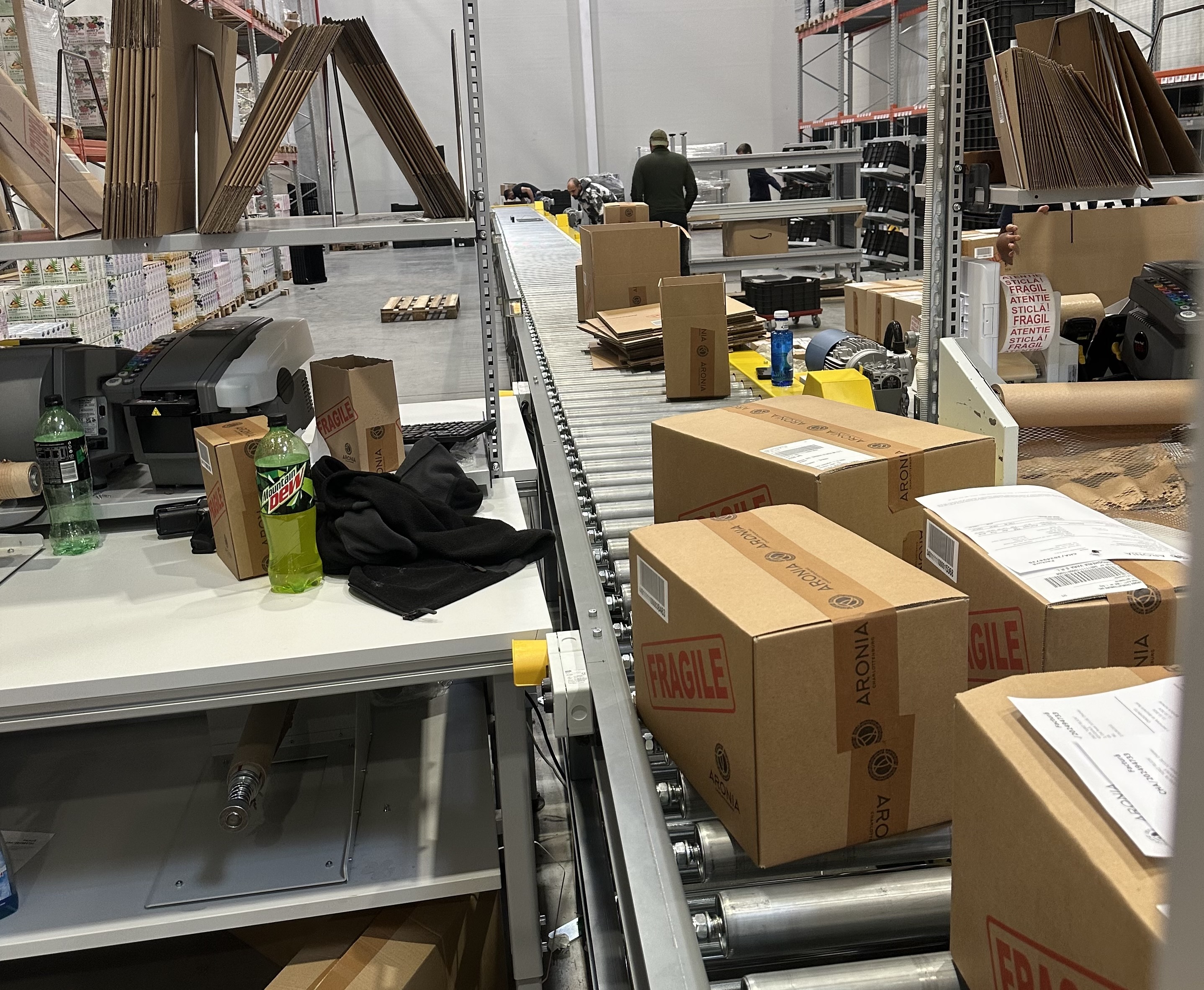 After completing multiple orders, these bins are placed on a 15-meter conveyor belt, which transfers them to the final packaging and labeling area.