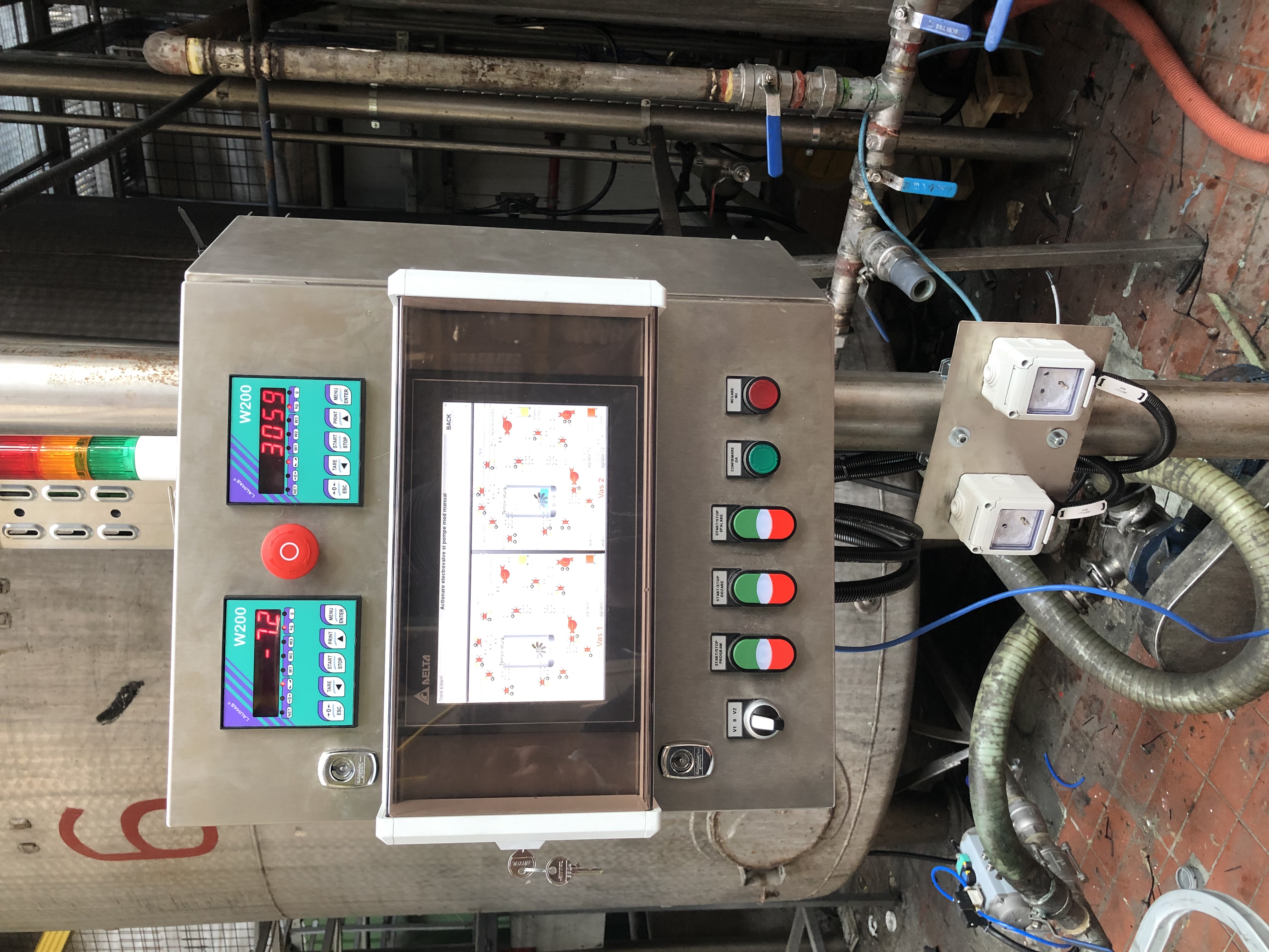 Mixing is performed either by a high-power agitator or by recirculation pumps, automatically controlled depending on the recipe type.The entire substance flow is controlled through a network of pneumatic solenoid valves monitored in real time by the PLC.