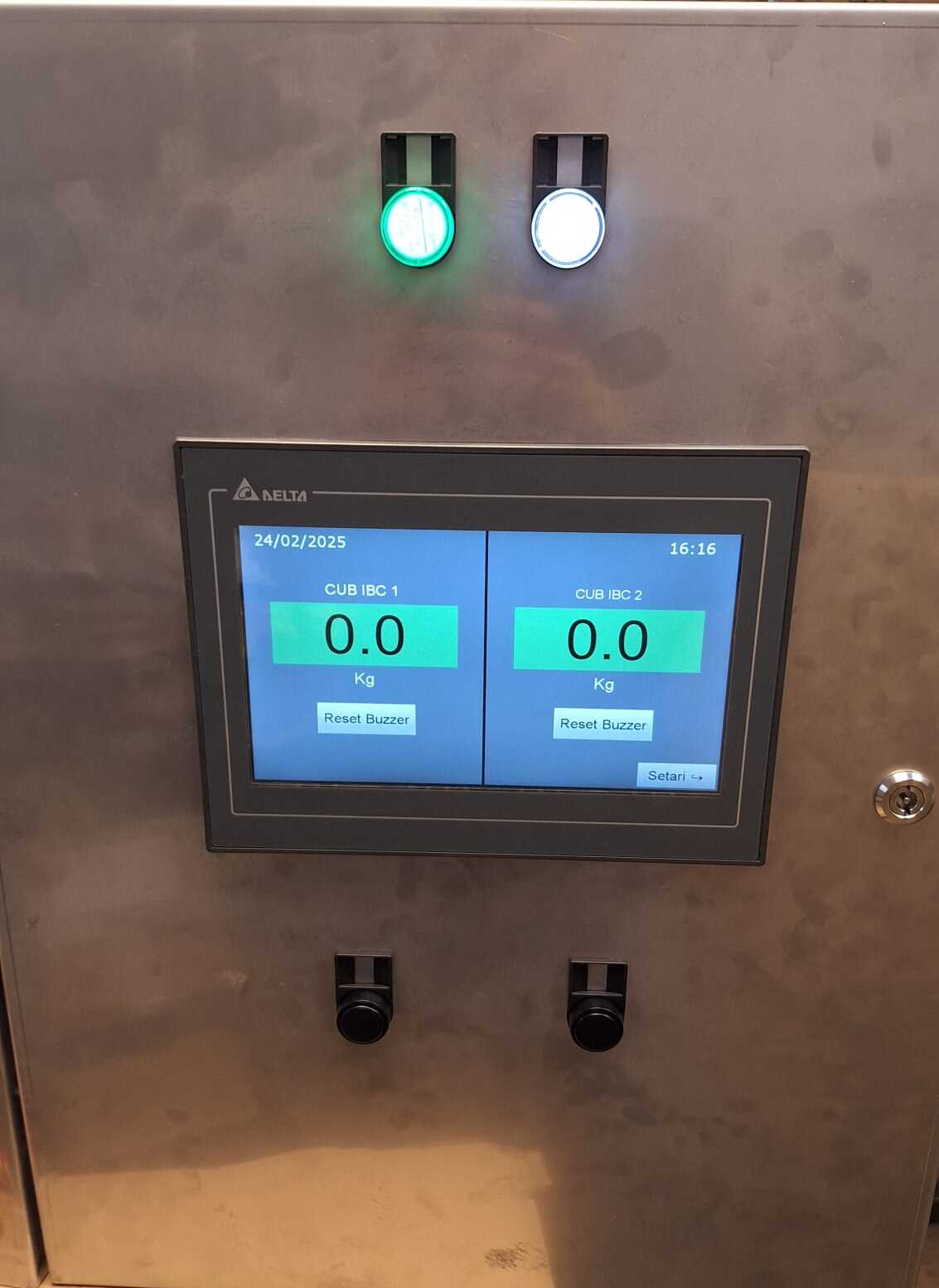 The system uses one or two IBC containers placed on a stainless-steel platform equipped with four high-precision load cells. The operator positions the container using a forklift, and the platform continuously transmits the measured weight to the PLC.